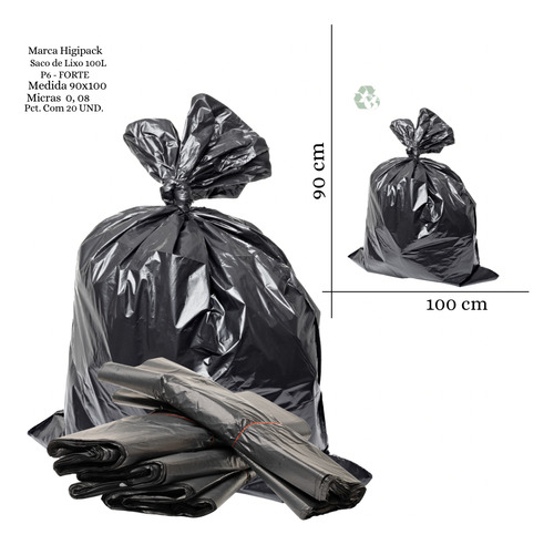 Saco De Lixo 100 Litros Forte P6 - 200 Unidades Cor Preto (pacote 6kg 90x100 0,08Micras) 12kg