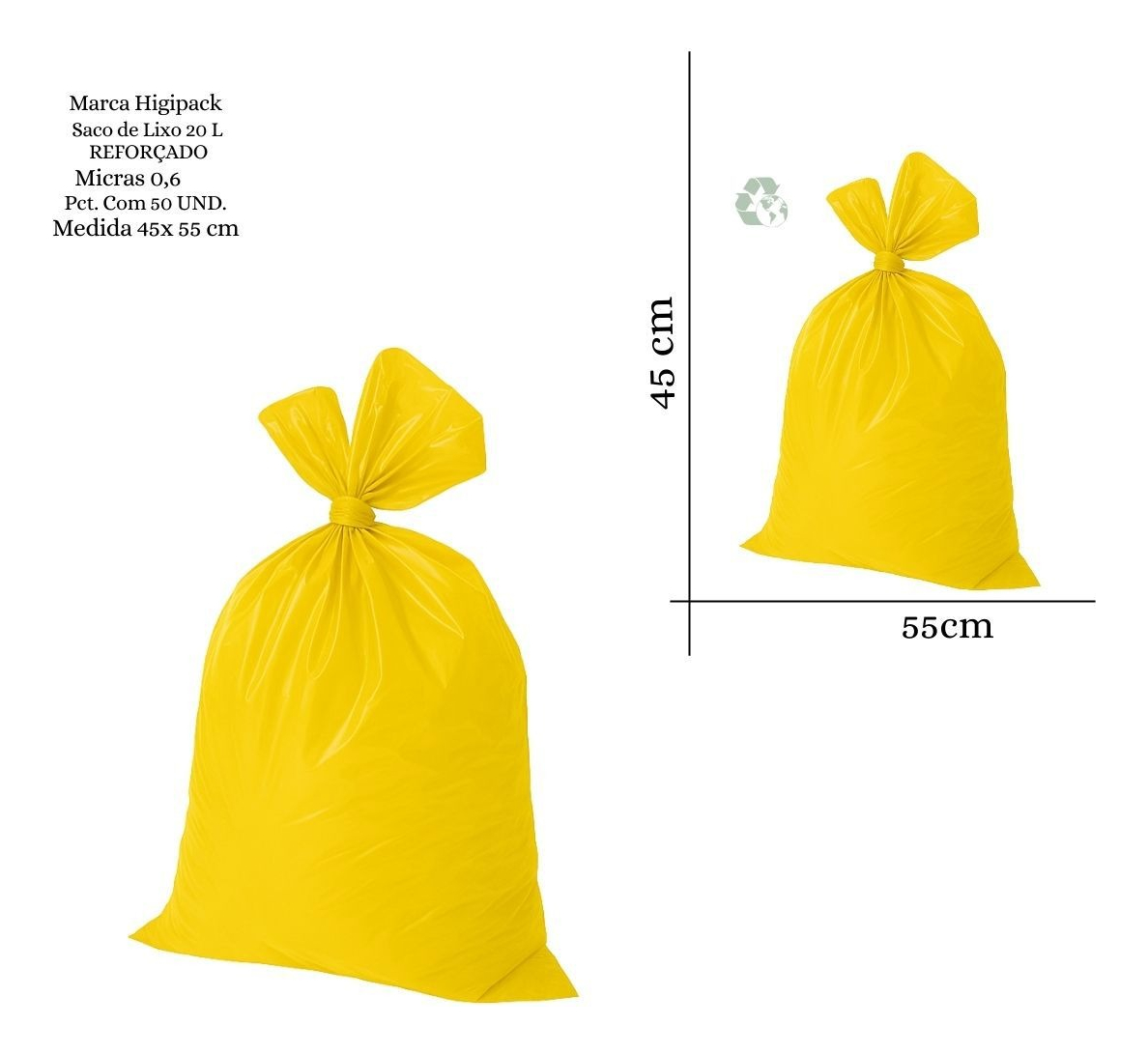 Saco De Lixo 20 Litros Reforçado - 50 Unidades Cor Amarelo (pacote 1,2kg 45x54 0,08Micras) 0,6KG